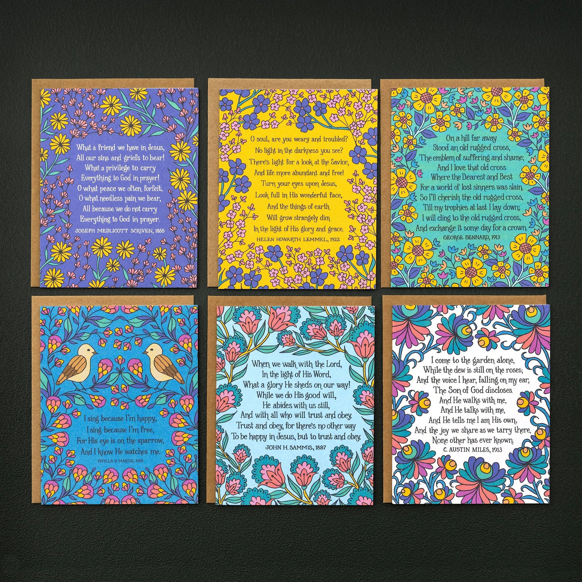 "Set One" set of 6 cards includes: His Eye On The Sparrow ⧫︎ In The Garden ⧫︎ The Old Rugged Cross ⧫︎ Trust & Obey ⧫︎ Turn Your Eyes ⧫︎ What a friend