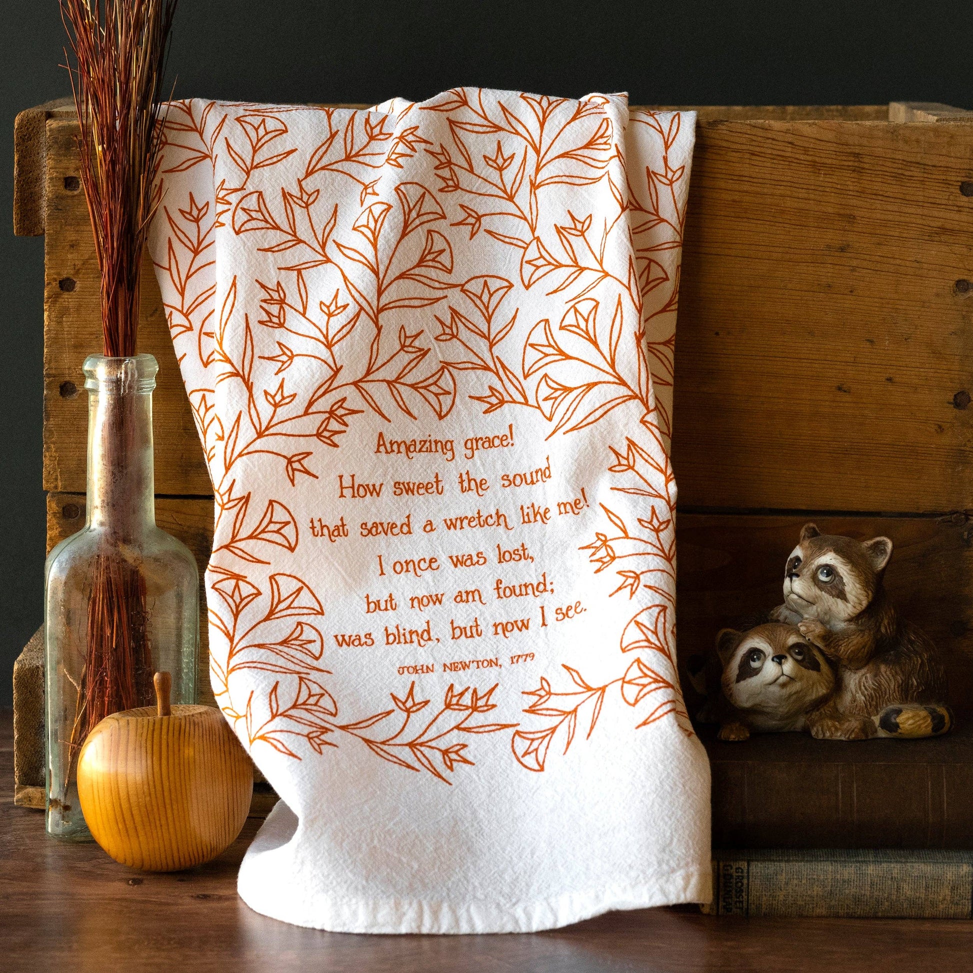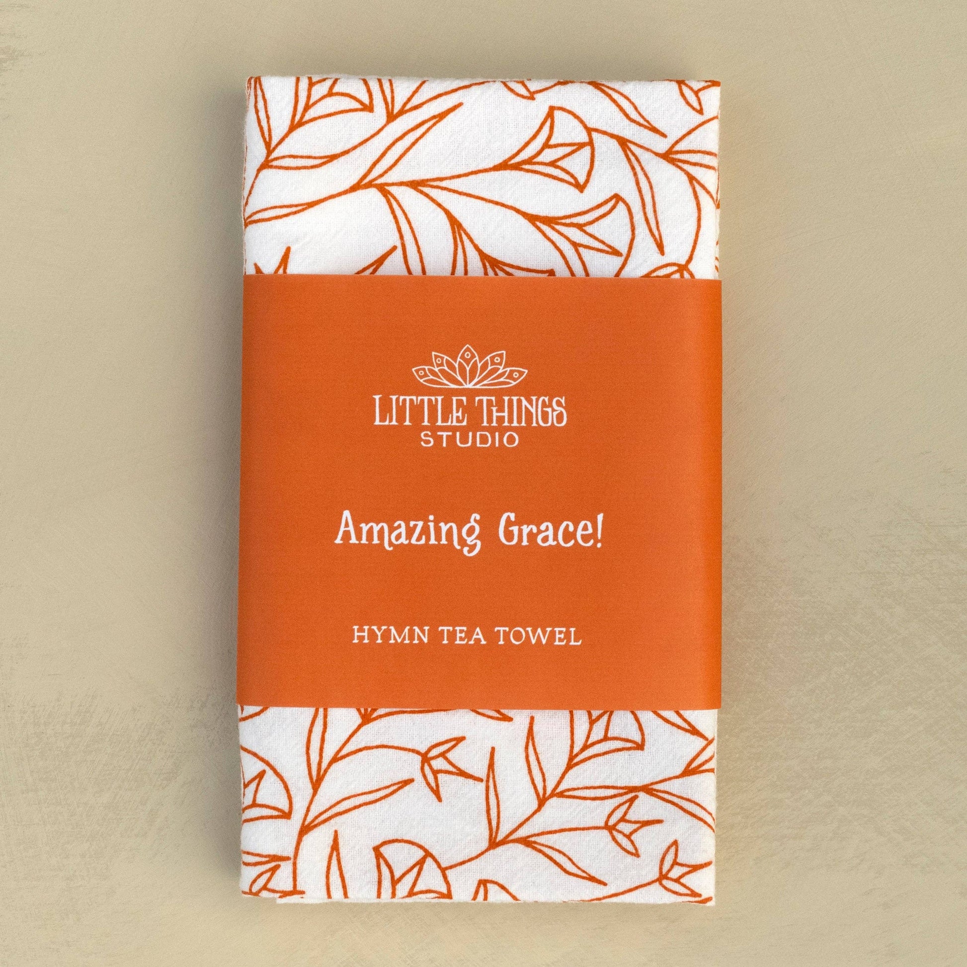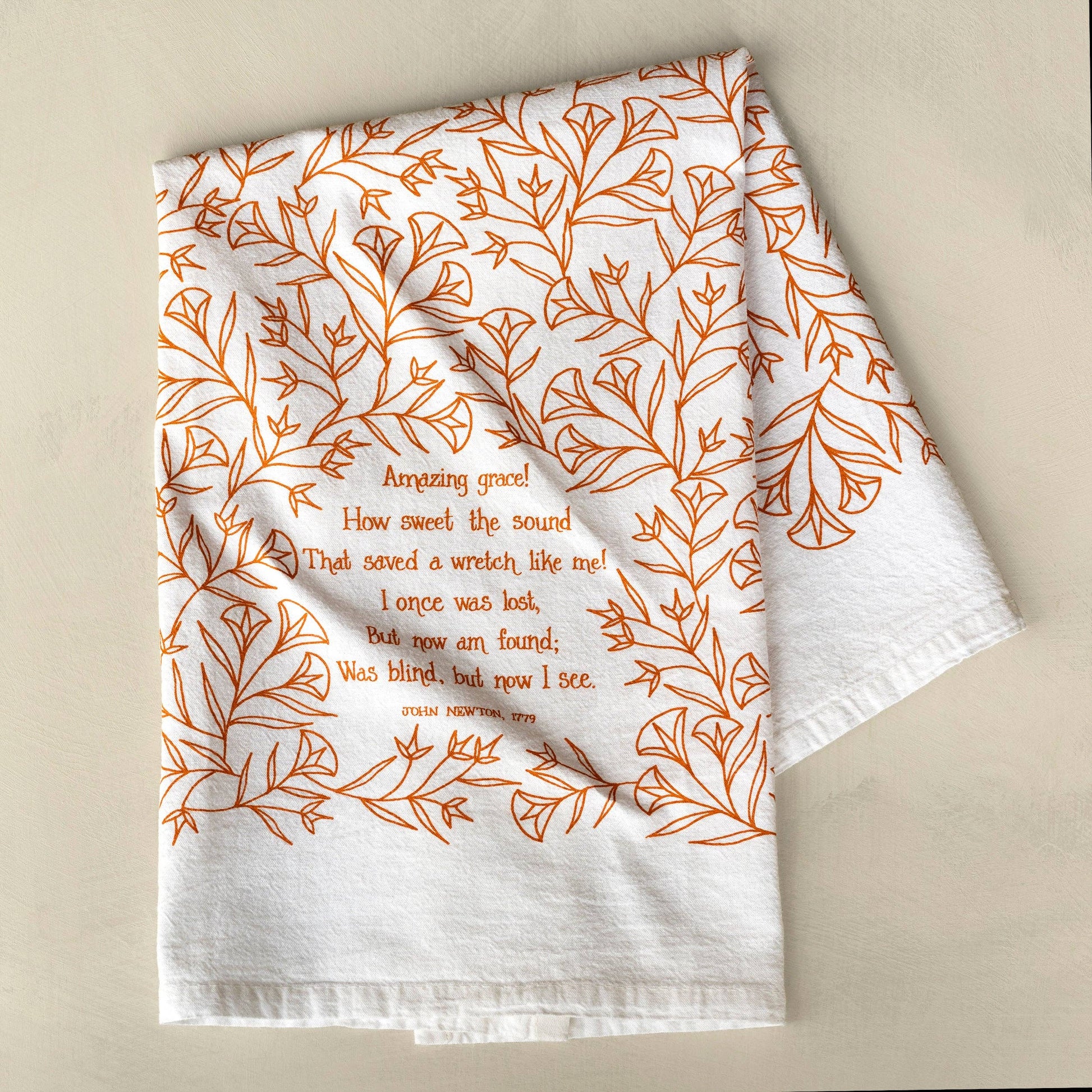 Our hymn tea towels brighten your home with color and song. The Amazing Grace hymn tea towel is printed in marmalade and features lyrics from the hymn. Made of 100% cotton, these flour sack tea towels easily and cost-effectively replace disposable paper towels with high absorbency and durability. Generously sized, lint free, and made to last a lifetime. Illustrated by Kate Whitley.