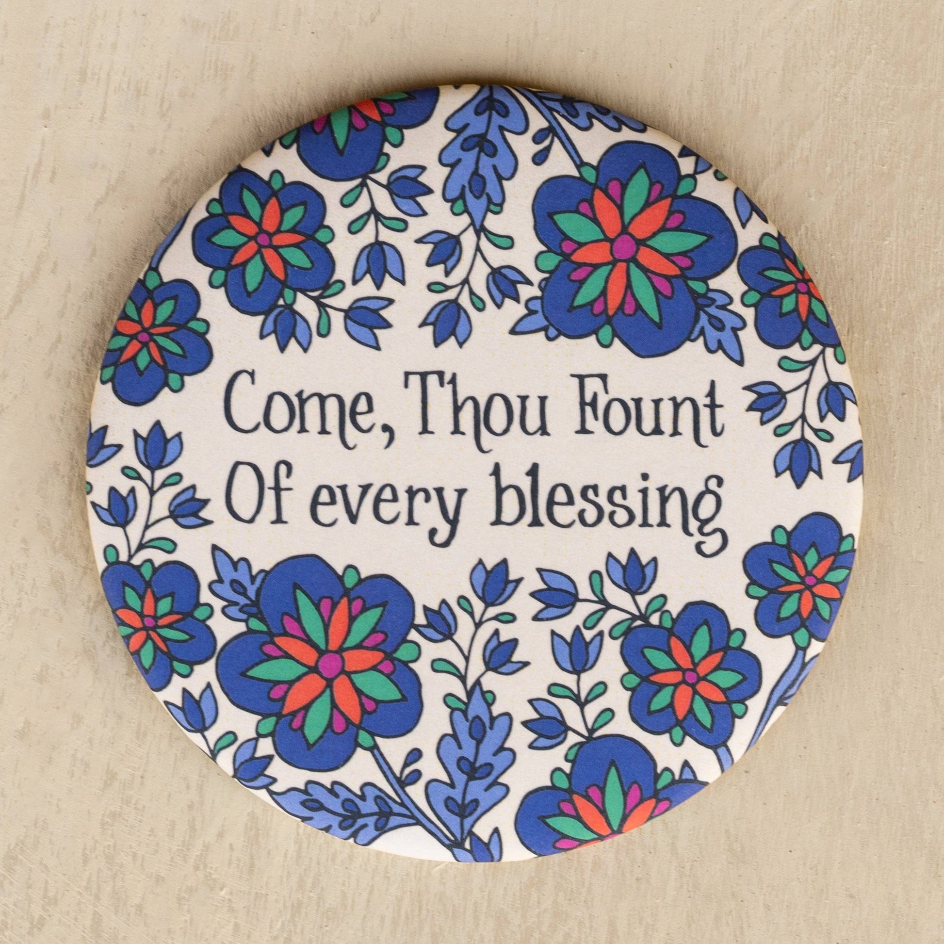 This hymn magnet features lines from the beloved hymn Come Thou Fount. The text is surrounded by a vibrantly colored floral design with an eggshell background. Illustrated by Kate Whitley.