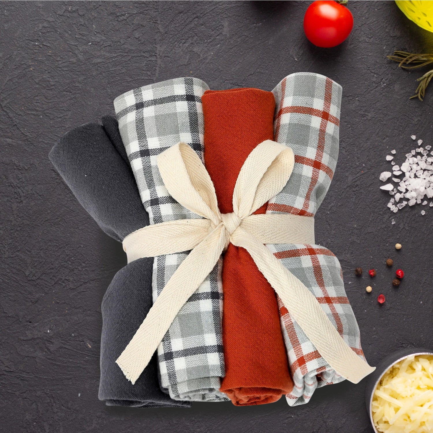 This stylishly versatile set of tea towels showcases 4 bold hues. Machine Wash Warm, Gentle Cycle, Do Not Bleach, Tumble Dry Low, Warm Iron if Needed.