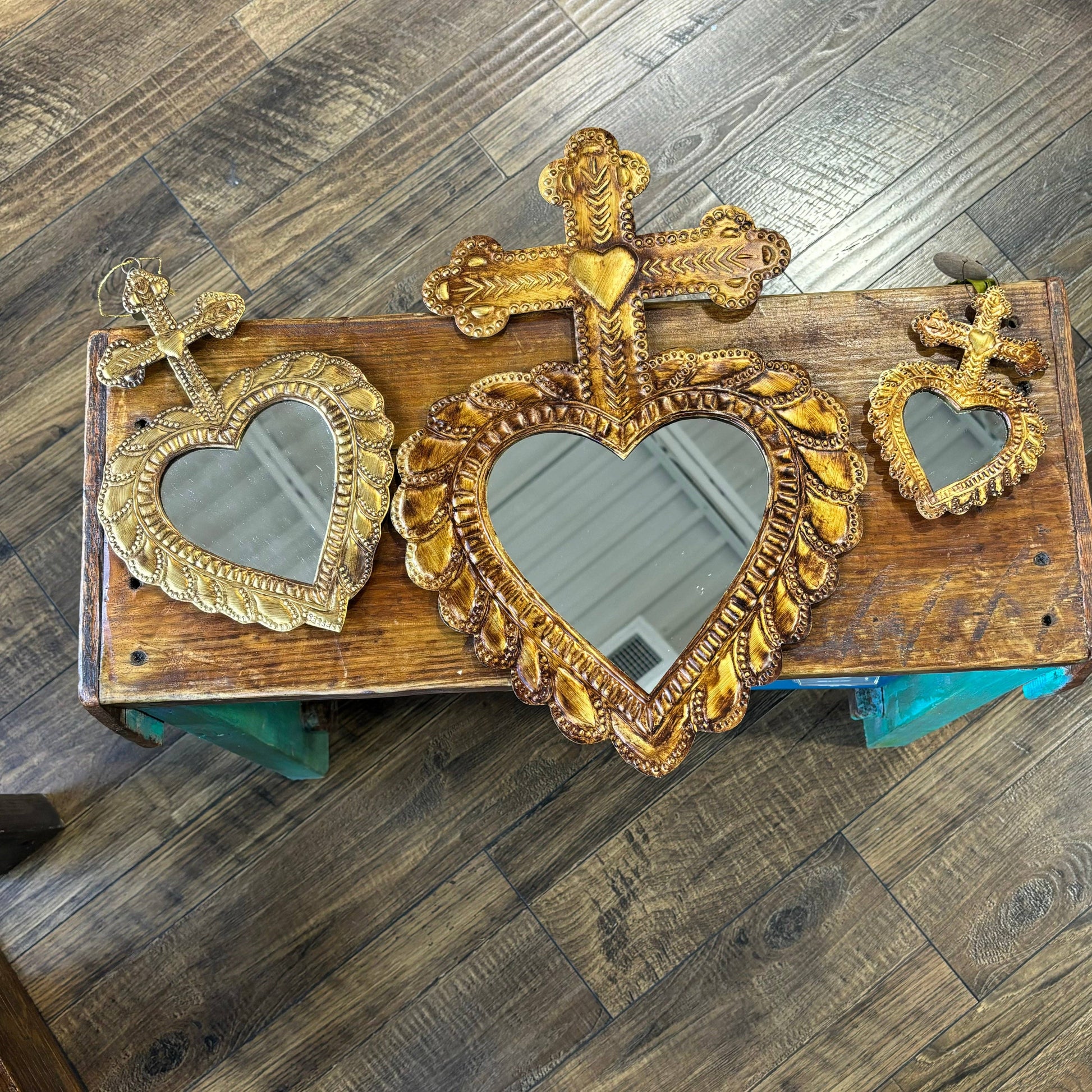 Tin Cross atop Sacred Heart mirror. Made in India.