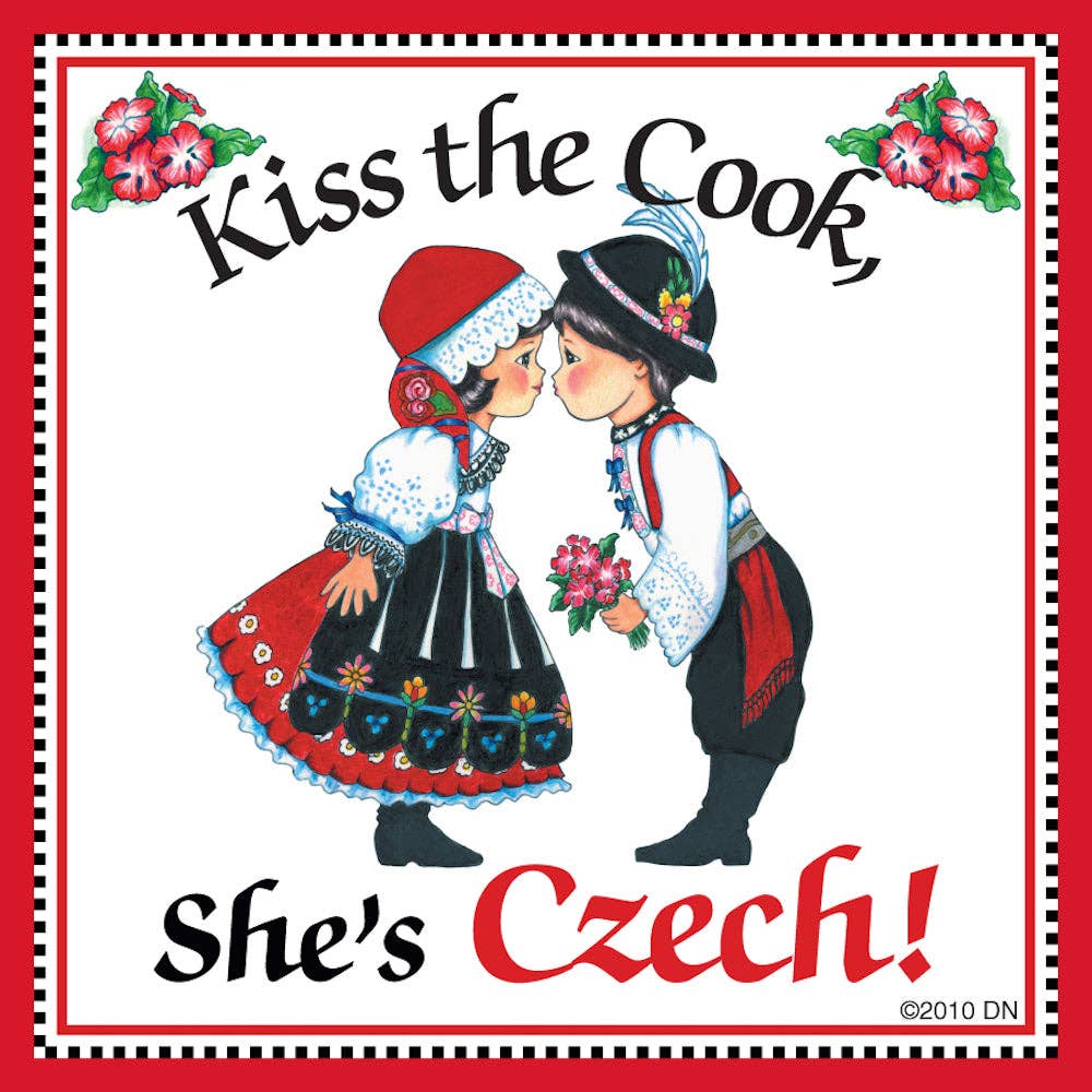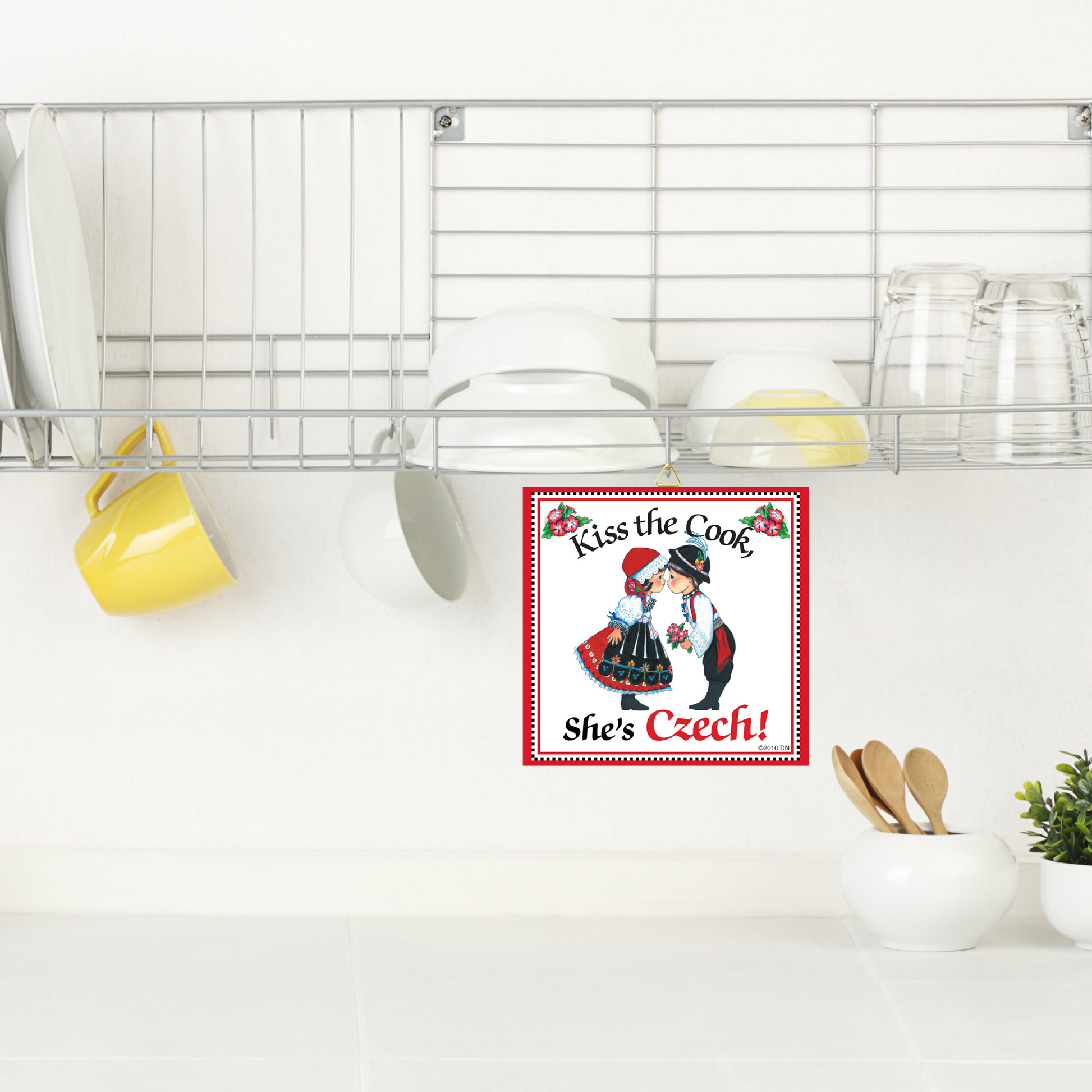 This charming wall decor tile will surely brighten up your kitchen. The unique artwork on this wall hanging tile will make for an excellent unique Czech gift. This high quality wall decor tile features a sturdy metal hook for hanging. This ceramic wall plaque features the saying: "Kiss the cook, she's Czech"