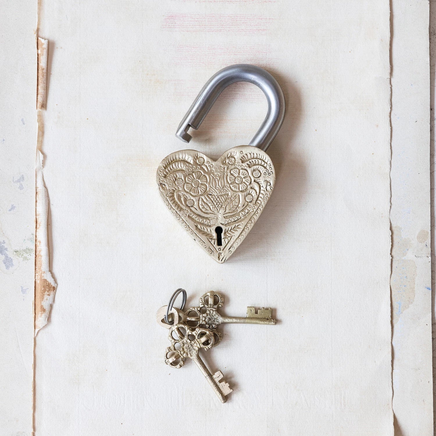 Show love and appreciation to a special person with this brass and stainless steel heart-shaped lock. This lock is a beautiful and functional piece that can be used as a symbol of commitment or a keepsake. The lock features a debossed floral design that adds charm and elegance to the heart shape. The lock has a matte finish that gives it a subtle and sophisticated look. The lock comes with 2 brass keys that match the lock and can be used to open and close it. The lock is made of brass and stainless steel materials that are durable and stylish. They can withstand rust and corrosion, and have a smooth and shiny surface. The lock Measures 4.5 inches in length and 3 inches in width, making it a small and delicate decoration for the home. The lock can be used to secure a chest, a diary, a jewelry box, or a gift, or simply displayed on a shelf, table, or mantel. This lock is a lovely accent piece for farmhouse, French country, vintage, or Victorian-style decor. It is a perfect way to add romance and elegance to the home.