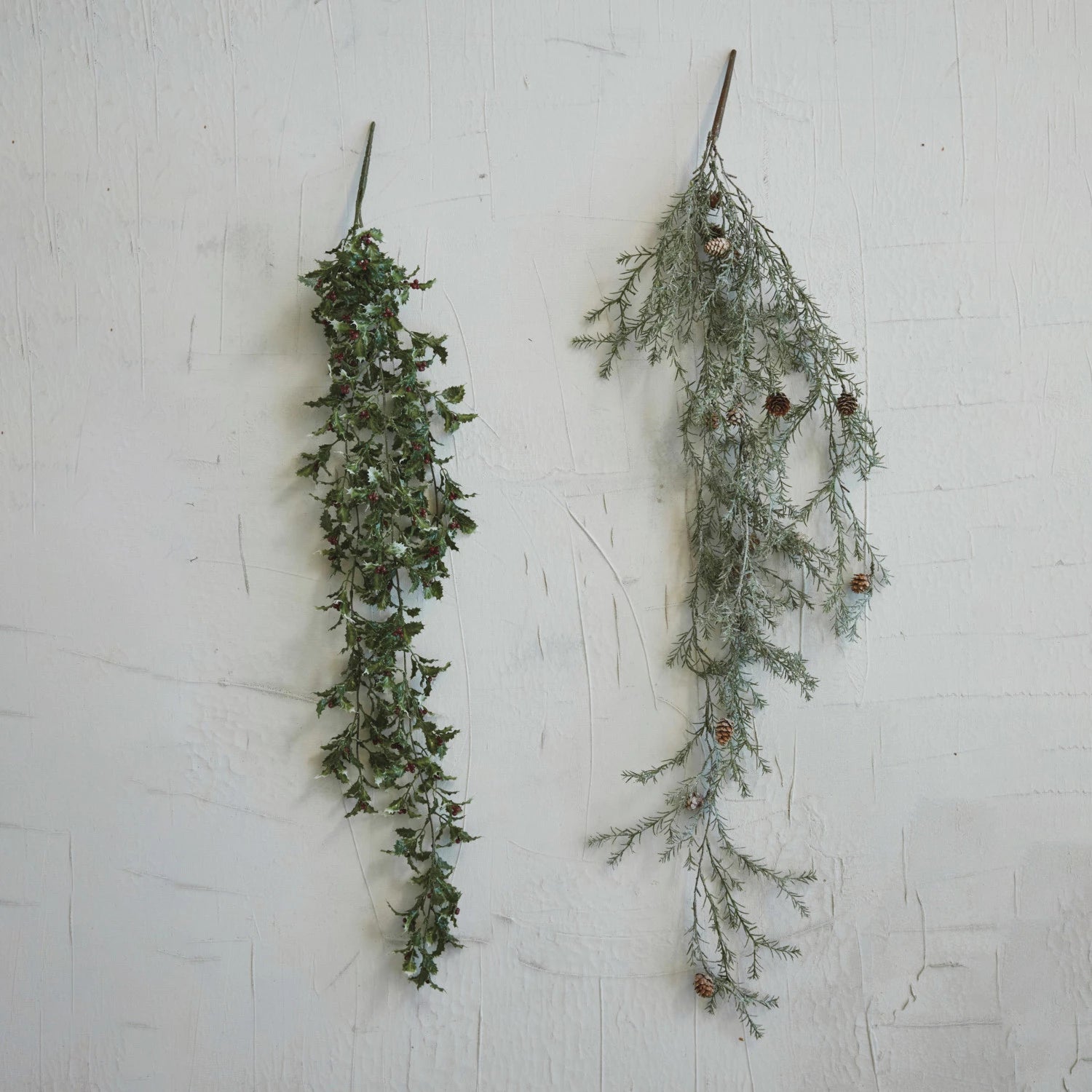This faux pine spray captures the essence of a winter forest with its frosted finish and interspersed pinecones. At 43.25 inches long and 7.75 inches high, it's a substantial piece that can be used to enhance a variety of settings. The green polyethylene needles are designed to mimic the look and feel of real pine, while the pinecones add a touch of authenticity. Whether used as part of a larger display or on its own, this faux pine spray is a beautiful, maintenance-free way to bring the outdoors into any and every home during the holiday season. This faux pine spray is sure to impress all who see it. A wintry faux pine spray adorned with natural pinecones and a delicate frost finish, bringing a touch of serene greenery indoors. An elegant complement to any winter decor, this spray is perfect for creating a festive yet sophisticated atmosphere. Ideal for draping over mantels, weaving through banisters, or accenting a holiday table, it adds a natural and frost-kissed look.