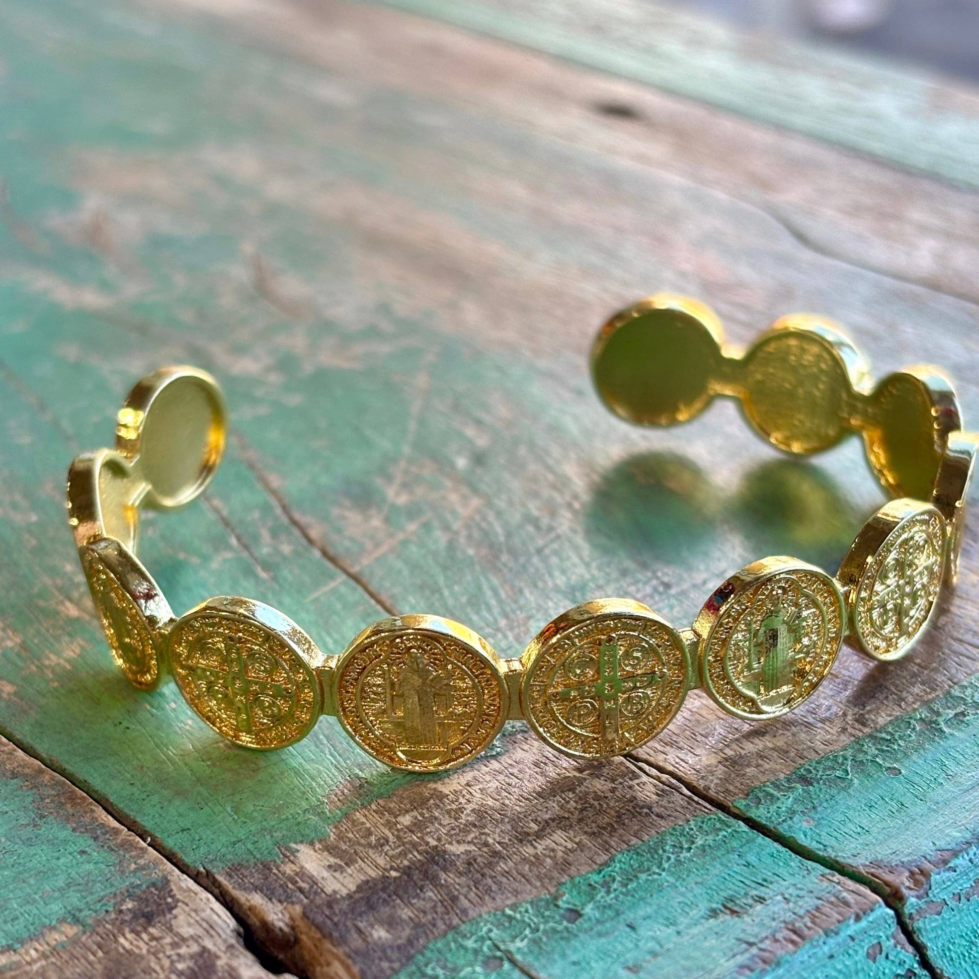 Gorgeous gold plated cuff bracelets with either St Benedict or OLG images. Can be adjusted to your size!