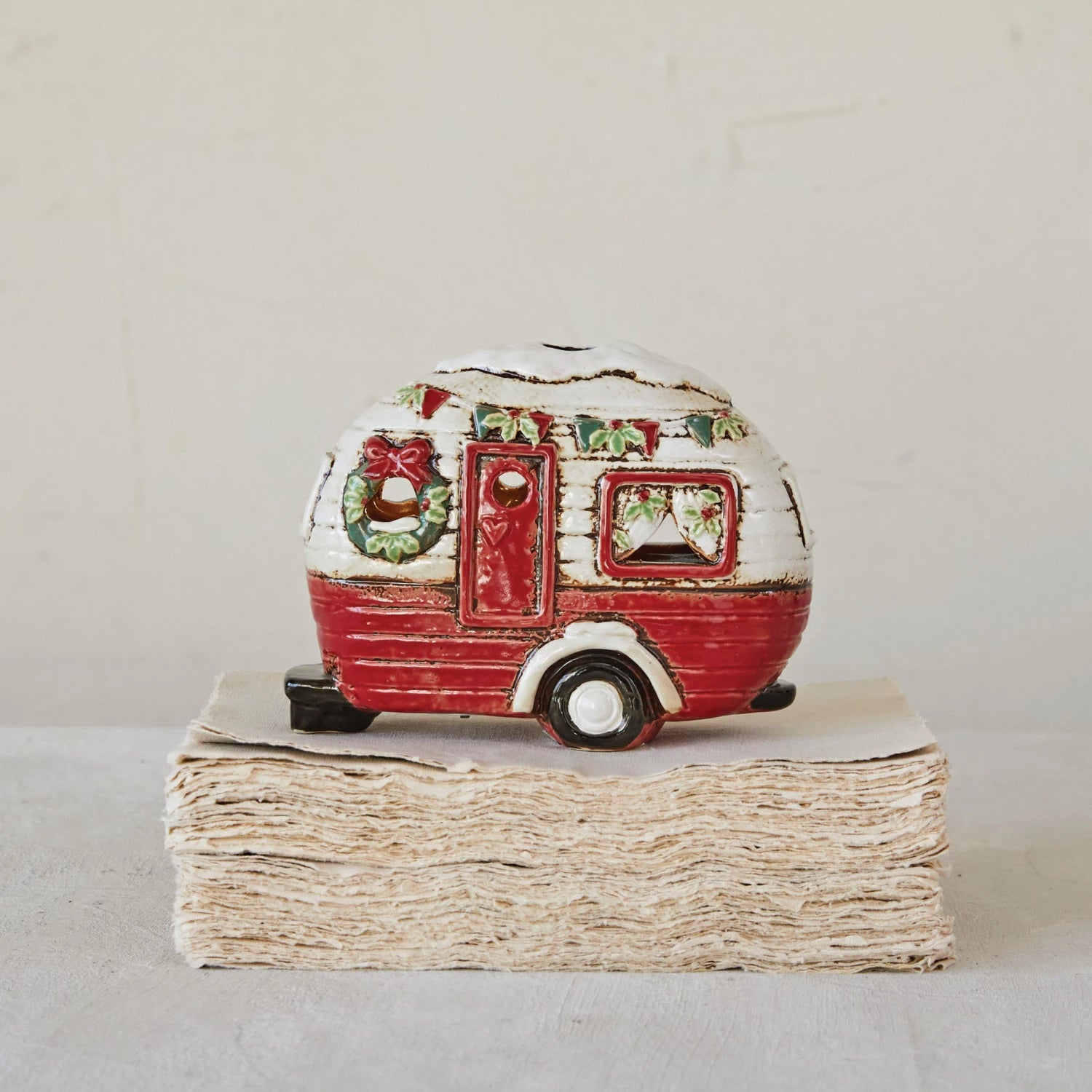 This whimsical stoneware camper features a naturally variating reactive glaze and interior LED lights. Indulge in the enchantment of the holiday season with our delightful collection of LED-powered decorative accents, featuring charming advent calendars, elegant tabletop trees, cozy stoneware houses, and captivating wall hangings.