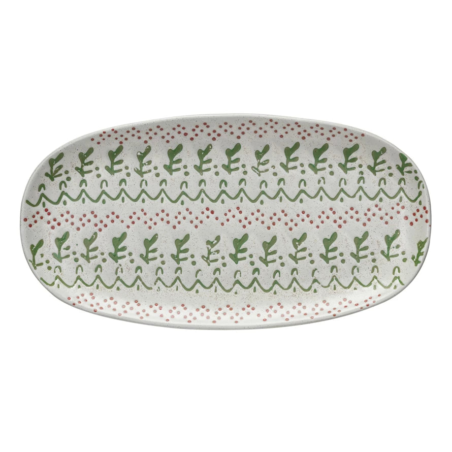This hand-stamped stoneware platter, adorned with a unique wax relief pattern, brings a burst of color and artisanal charm to the dining collection. The multi-colored design, measuring 13.25 inches long and 7 inches wide, offers a generous surface for serving appetizers, main courses, or desserts. The food-safe quality ensures that it's perfect for any occasion, from casual meals to special celebrations. Whether used for presenting any culinary creations or as a decorative element in the home, this platter is sure to impress with its blend of functionality and artistic expression. Handcrafted with care, each platter is unique and adds a touch of elegance to any dining experience. A multi-colored, hand-stamped stoneware platter with a distinctive wax relief pattern, showcasing artistic flair. A vibrant piece that adds a splash of color and texture to any dining experience, perfect for eclectic decor styles. This platter is ideal for serving a variety of dishes, adding a touch of handcrafted beauty to the table.
