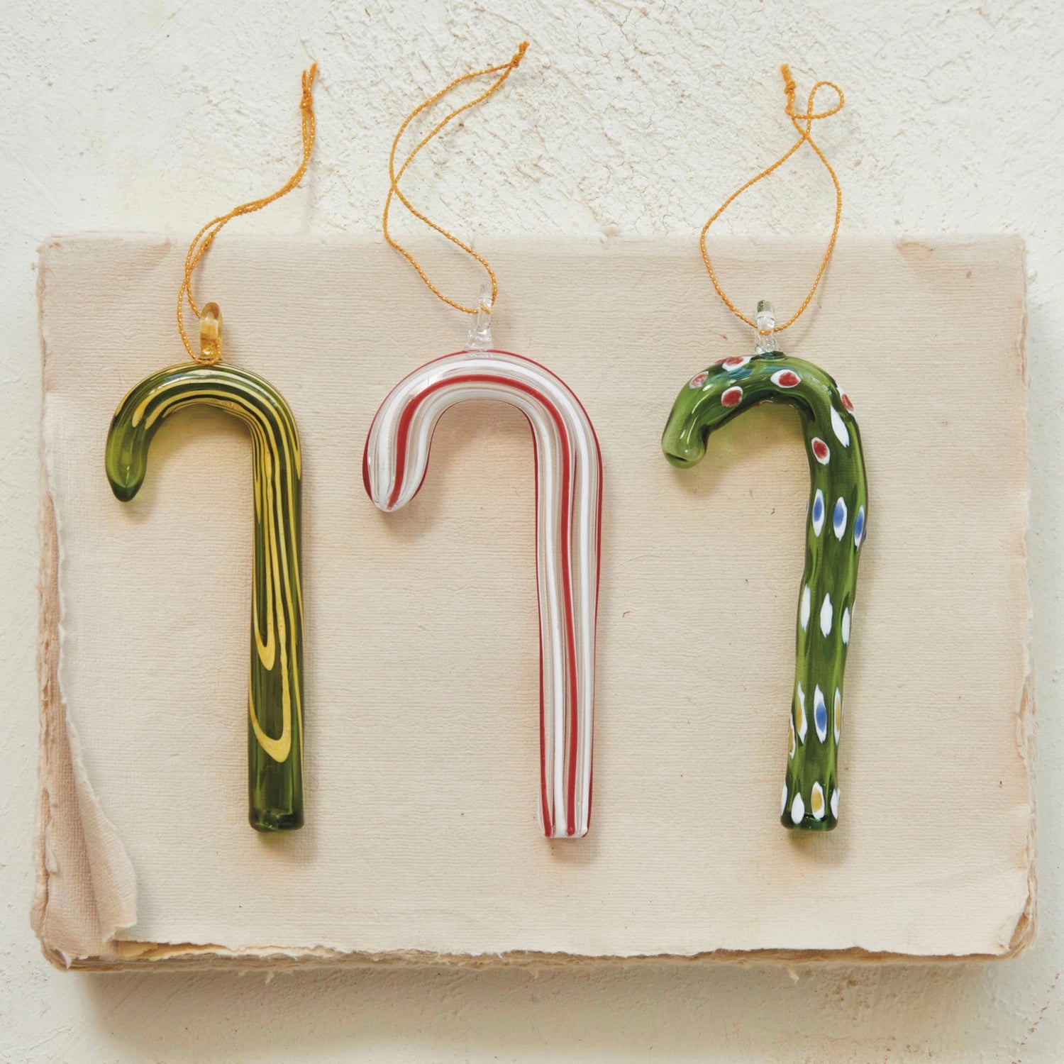 5"H Handmade Glass Candy Cane Ornament w/ Stripes, Multi Color, 3 Styles