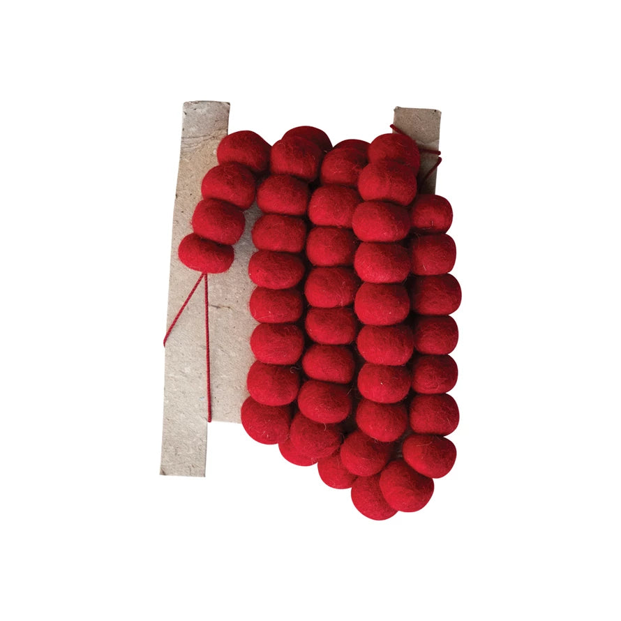 This handmade wool felt ball garland is a vibrant addition to any space, available in red and other cheerful array of colors that can complement decor styles. Stretching 72 inches long and standing 1 inch high, it's the perfect size to drape across a window, shelf, or wall, adding a pop of color and a dash of fun. The wool construction not only provides a soft texture but also adds a cozy feel to the home. Whether decorating for a special event or just want to liven up a room, this garland is sure to be a delightful presence. A colorful cascade of handmade wool felt balls in red, each a note in the symphony of this charming garland. An array of colors makes this garland a versatile piece, perfect for brightening up any room or occasion with its playful charm. Ideal for adding a whimsical touch to nurseries, playrooms, or as a festive decoration for parties and celebrations.