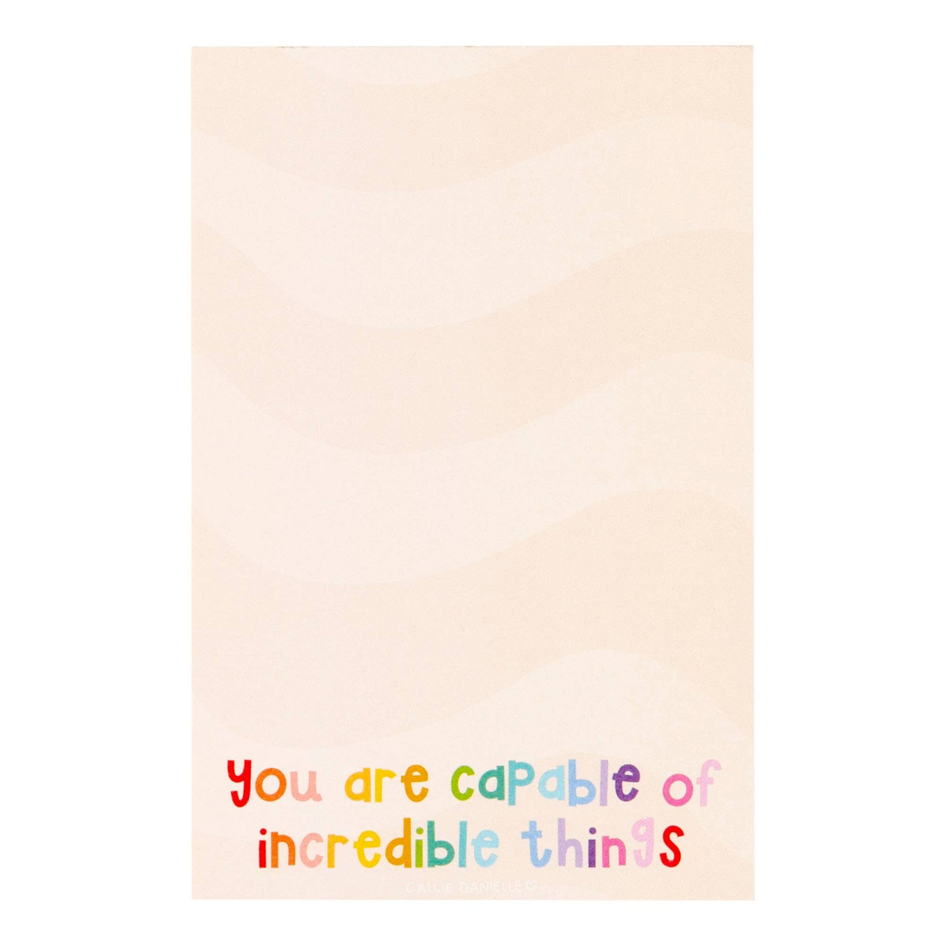 Brighten your day with our Incredible Things Notepad! Featuring the inspiring message "You are capable of incredible things" in colorful letters, this notepad is perfect for jotting down notes, ideas, and reminders. The fun wavy background adds a touch of charm, making it the perfect addition to your desk or workspace. Whether you're at work, school, or home, let this notepad remind you of your amazing potential every day. Stay motivated and organized with this uplifting notepad! • Features: 52 sheets, lined • Size: 4" x 6"