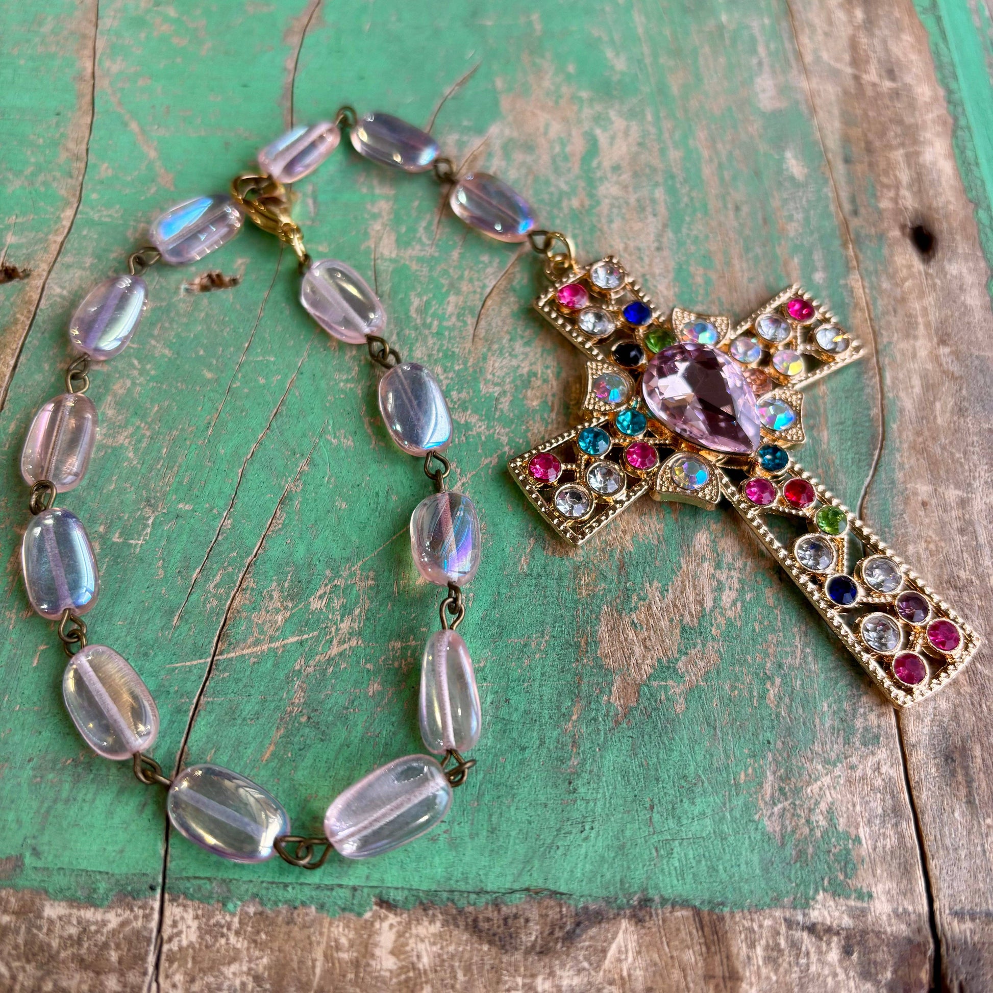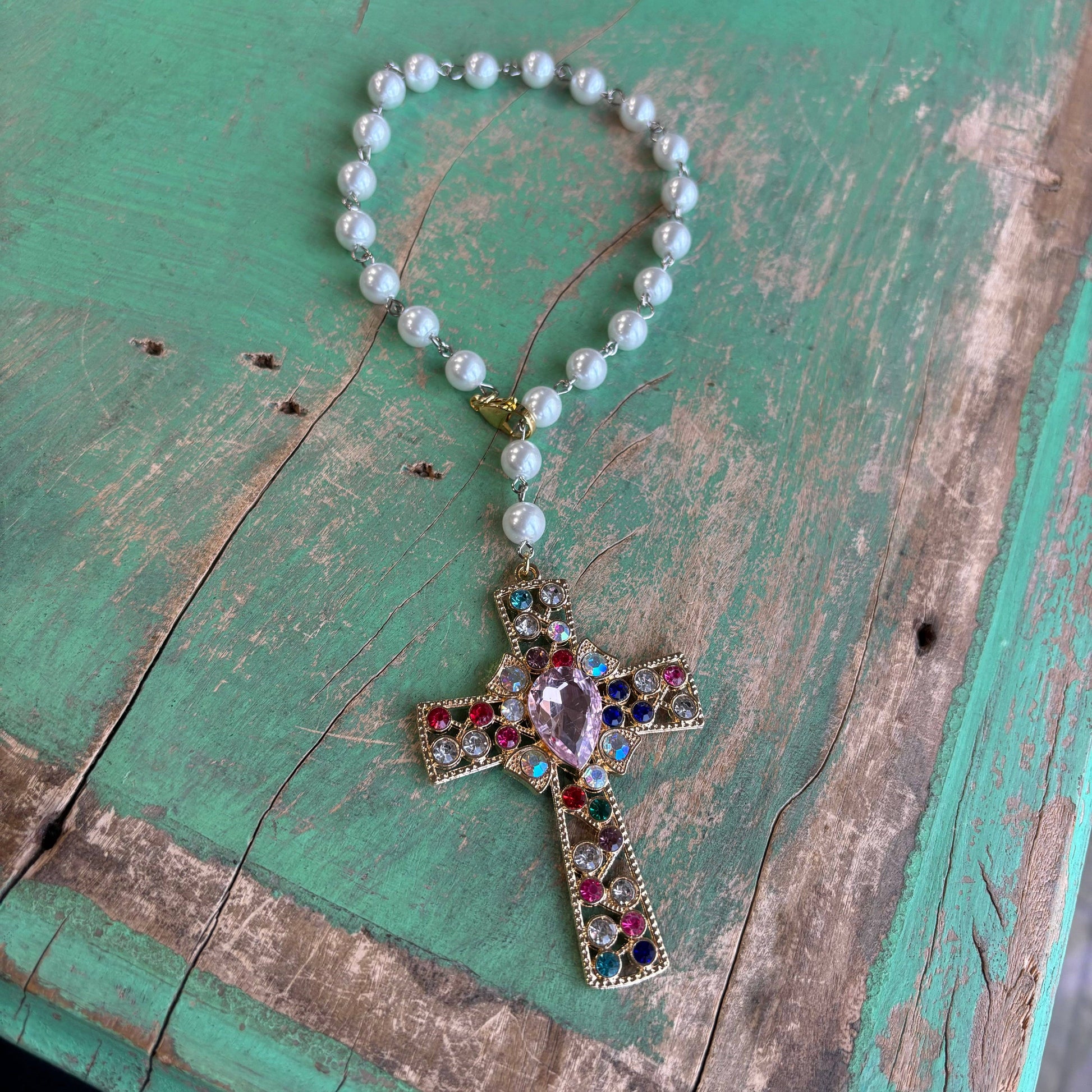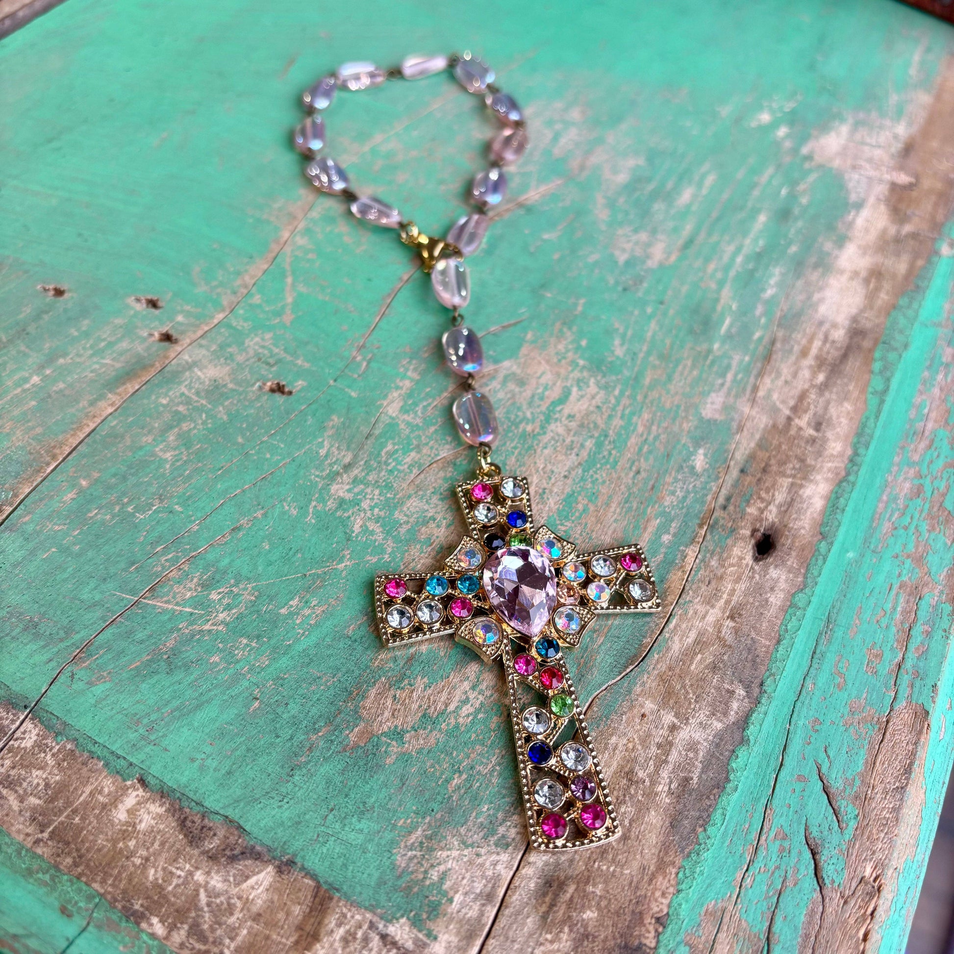 Gorgeous crystal cross with pink Czech glass beads! To protect you on the road. Can be added to car, purse, or door.