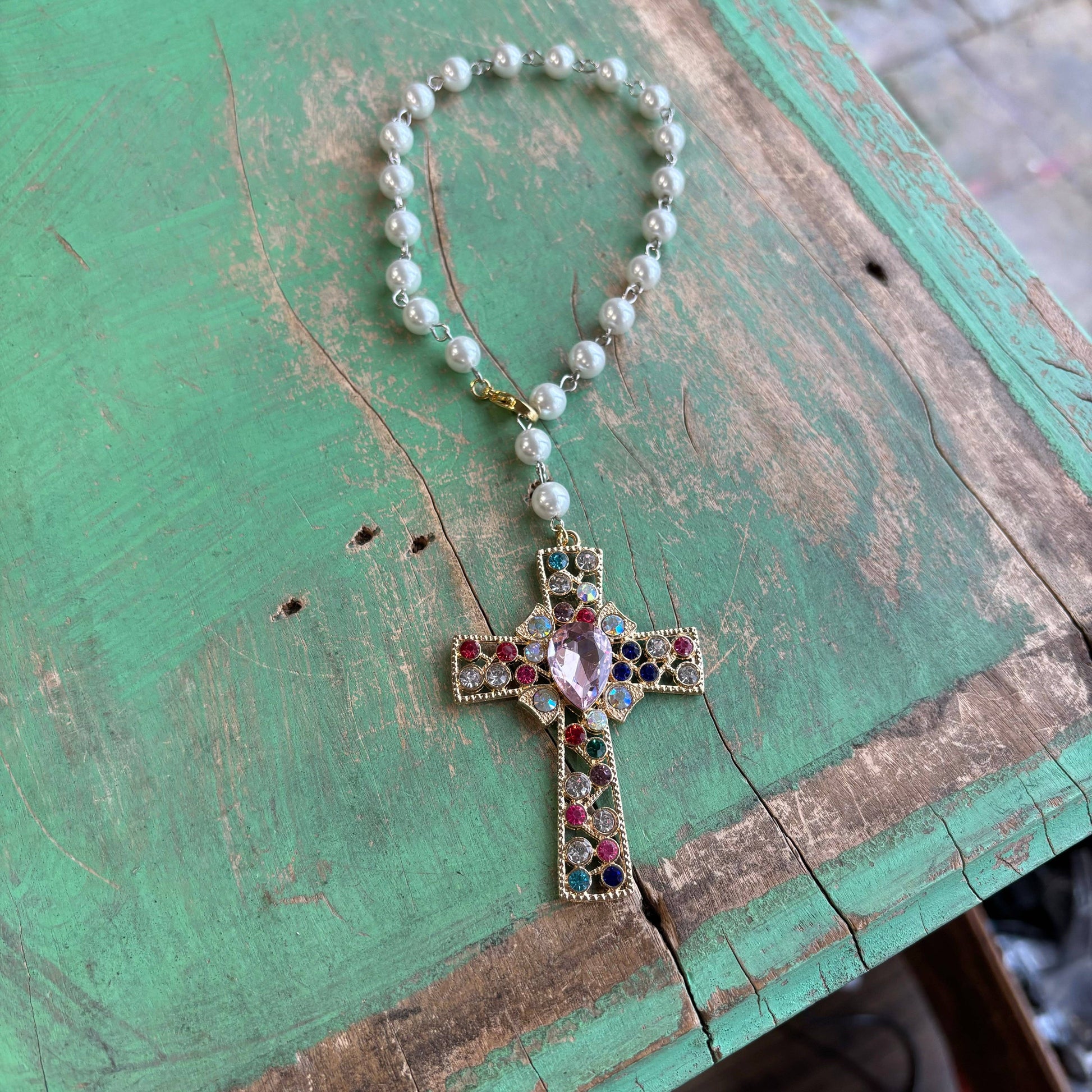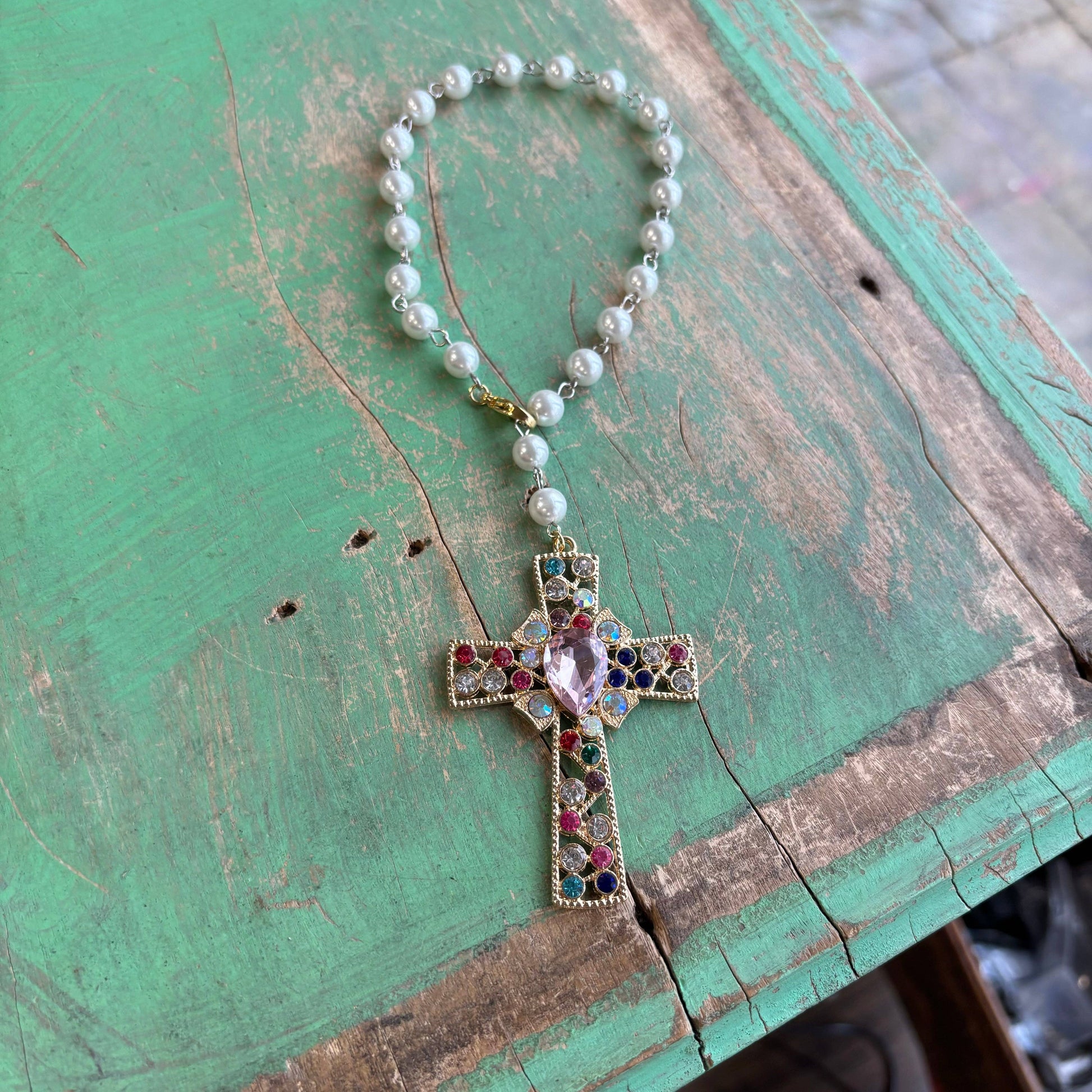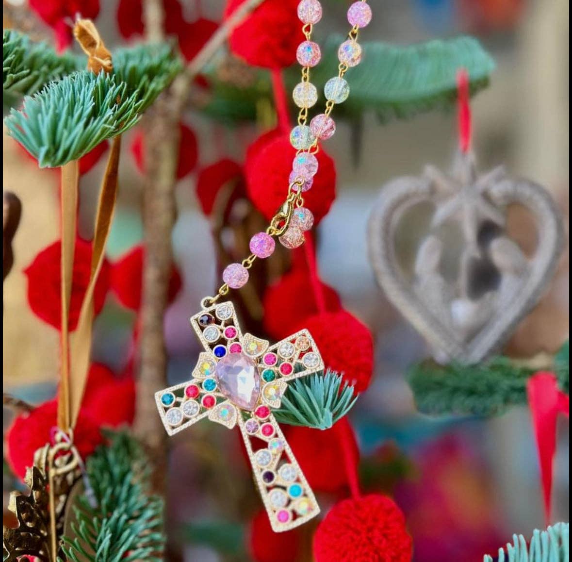 Gorgeous crystal cross with pink Czech glass beads! To protect you on the road. Can be added to car, purse, or door.