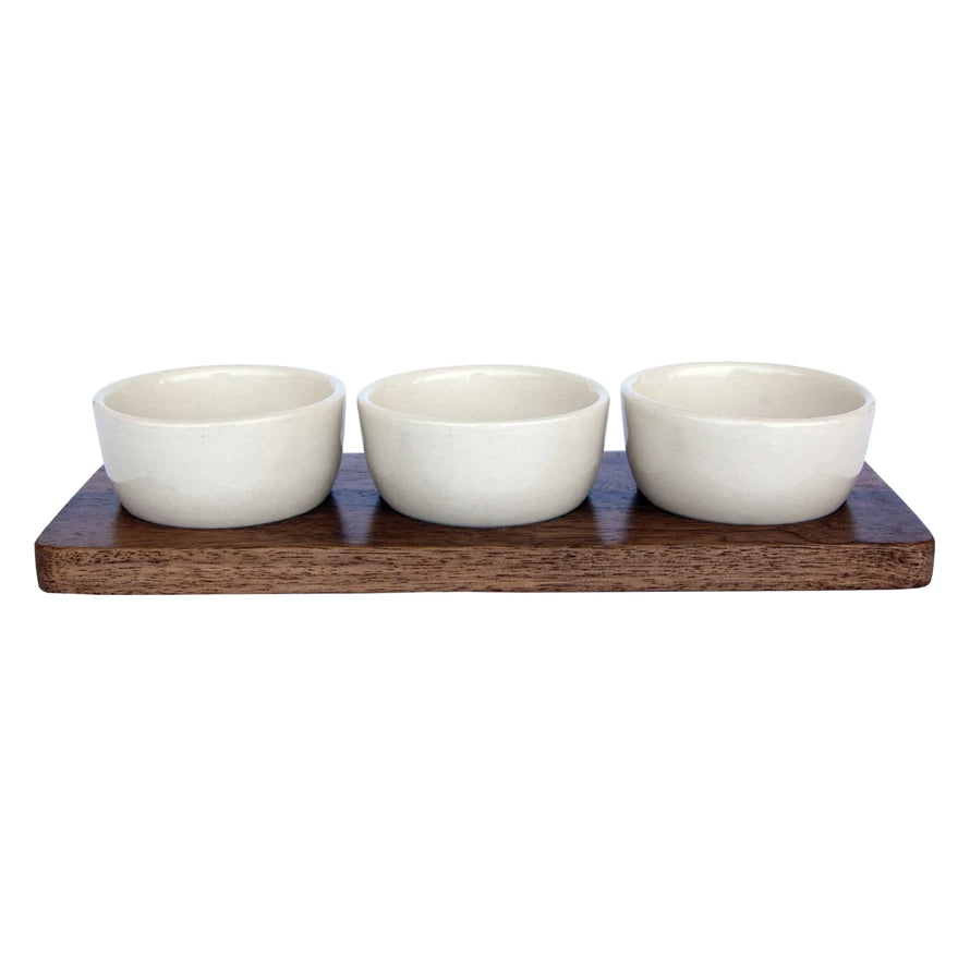 10-1/2"L x 4"W Mango Wood Tray w/ (3) 3-1/4" Round x 1-1/2"H 2 oz. Stoneware Bowls, Natural & Cream Color, Set of 4
