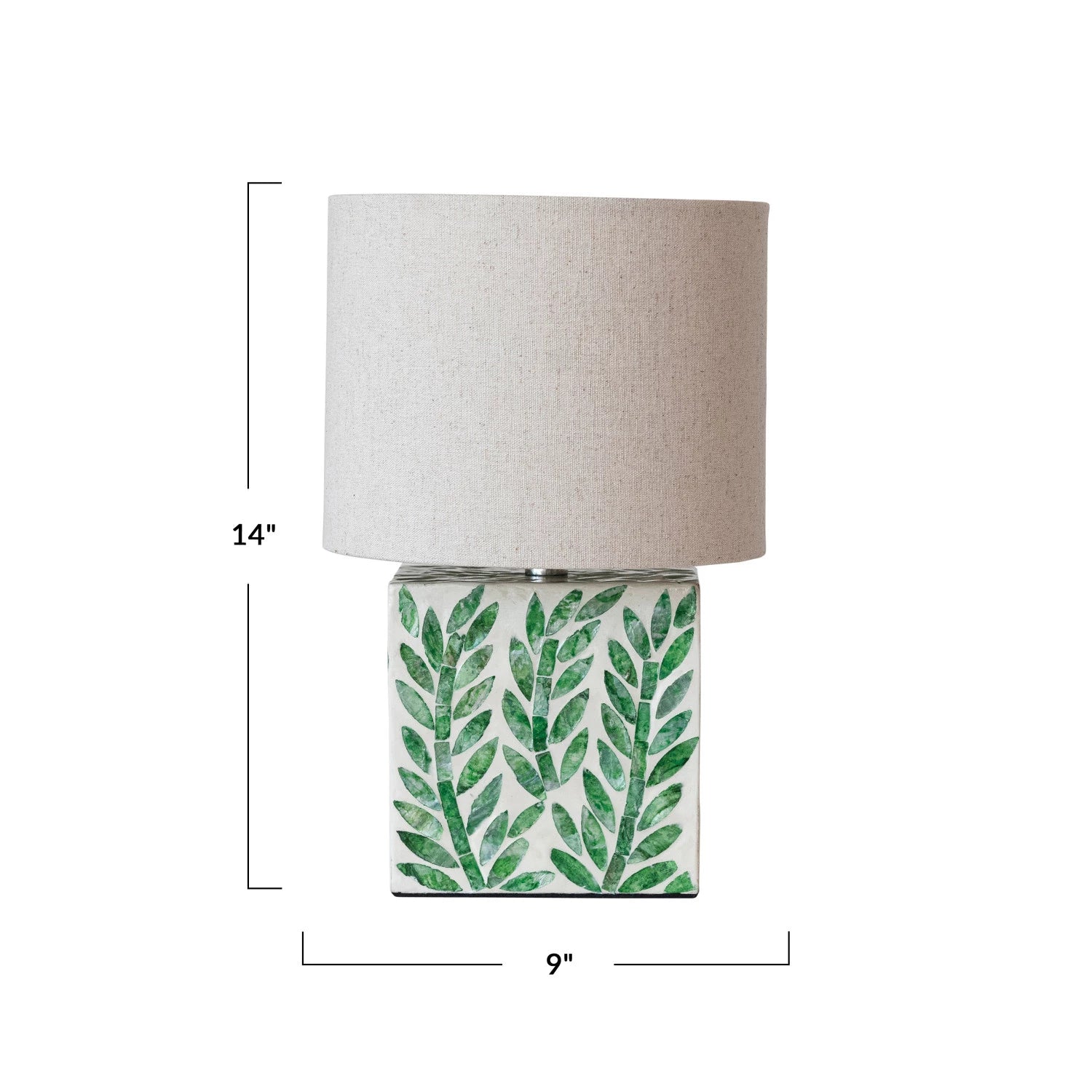 9" Round x 14"H MDF & Mother of Pearl Table Lamp w/ Botanical Pattern, Linen Shade & Inline Switch, Natural & Green (60 Watt Bulb Maximum)