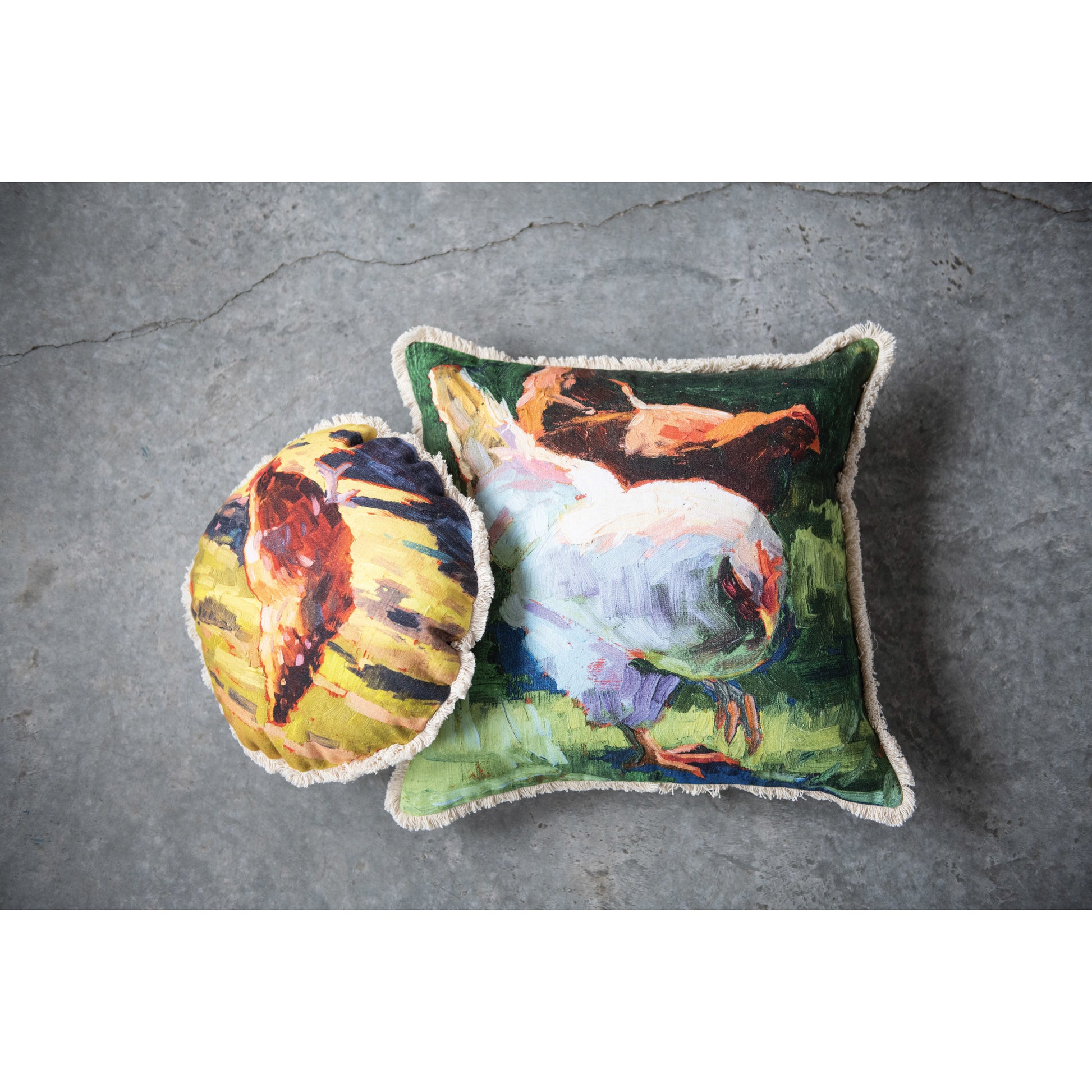 18" Square Cotton Pillow with Fringe & Chicken Image