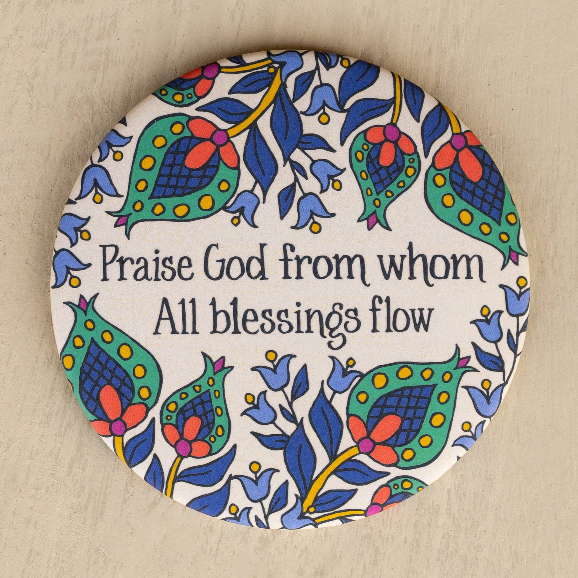 This hymn magnet features lines from the beloved hymn Praise God From Whom (Doxology). The text is surrounded by a vibrantly colored floral design with an eggshell background. Illustrated by Kate Whitley.