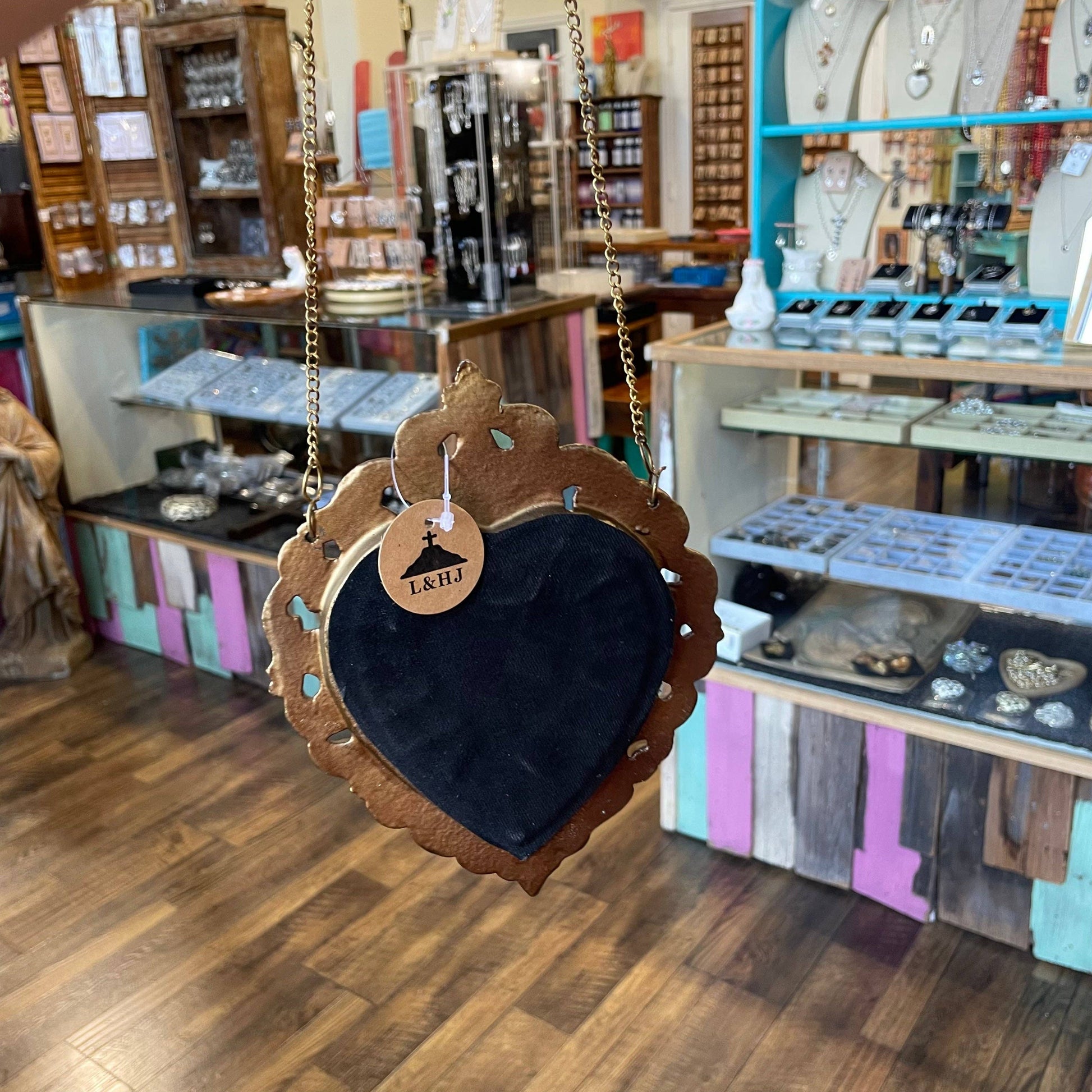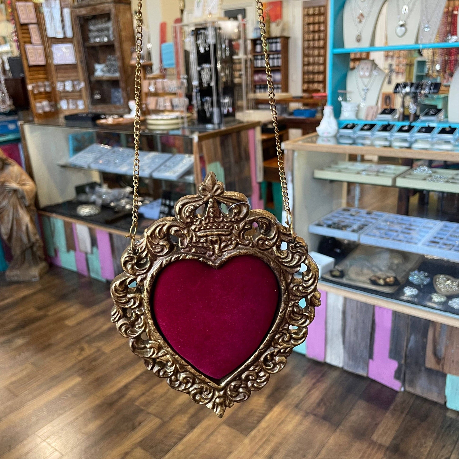 7.5” x 6” Sacred Heart with red velvet center. Chain is 16-18”. Made in India.