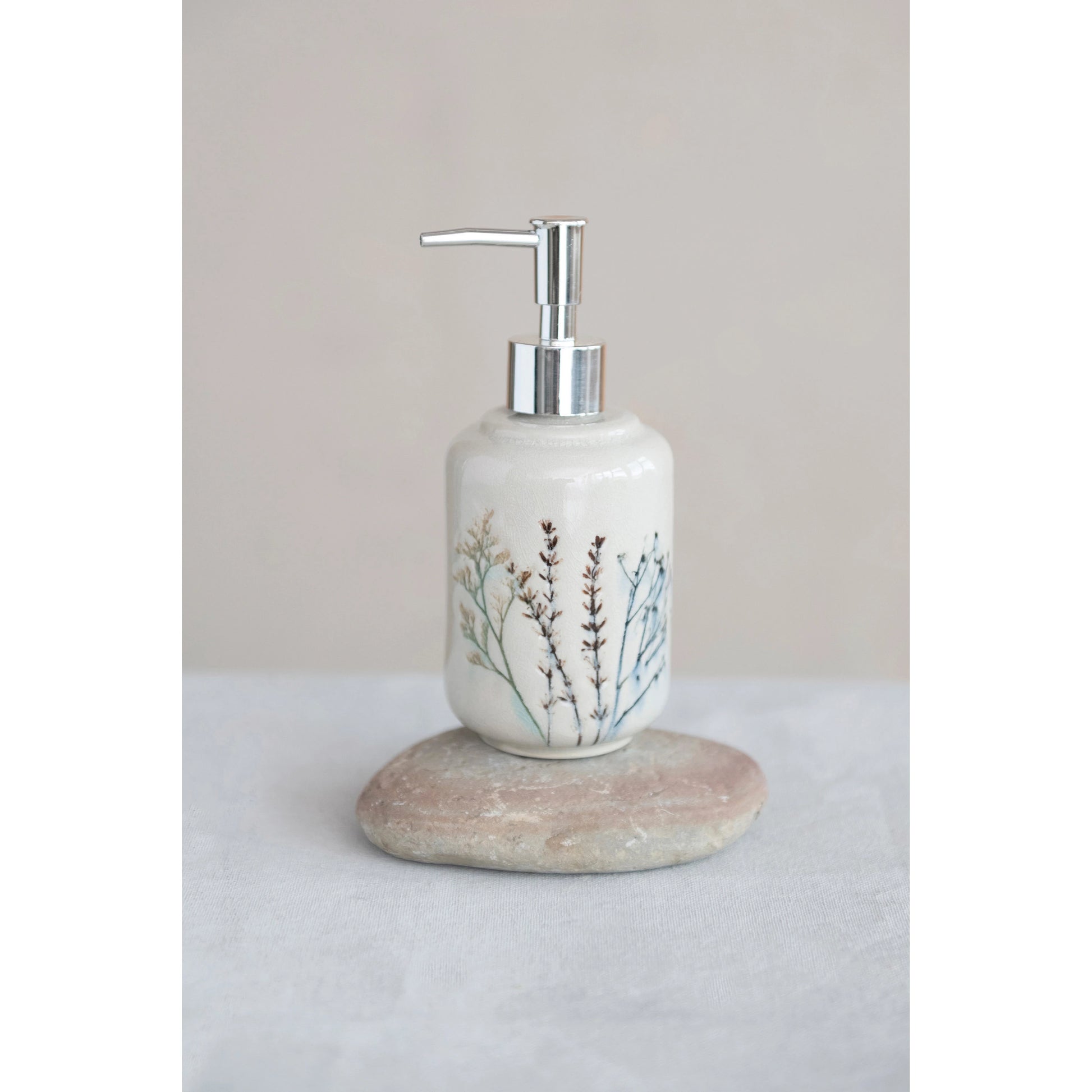 Debossed Stoneware Floral Soap Dispenser, Reactive Crackle Glaze