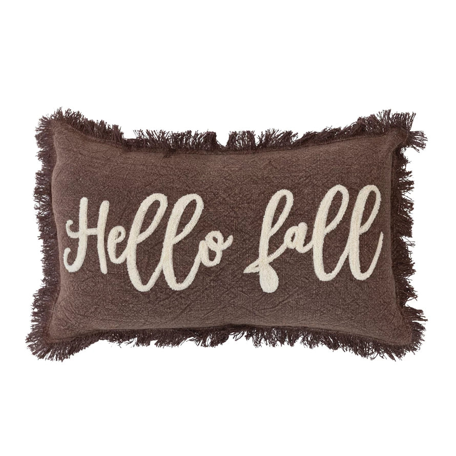Celebrate the arrival of autumn with our 20-inch by 12-inch Stonewashed Cotton Tufted Lumbar Pillow featuring a delightfully tufted "Hello Fall" message and charming fringe details in a warm brown and cream color palette. Crafted with care, this lumbar pillow effortlessly combines seasonal charm with inviting textures, adding a touch of fall coziness to your store. Perfect accent for a sofa, bed, or reading corner.