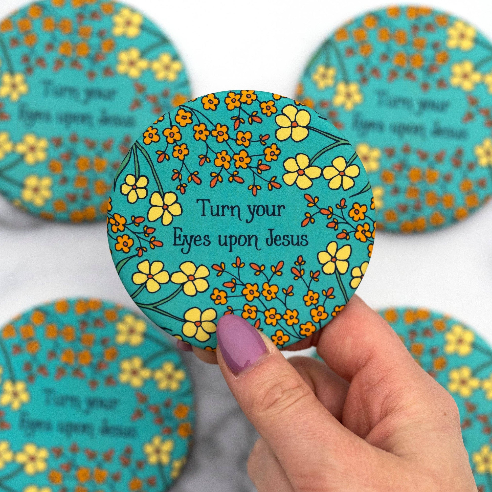 The Turn Your Eyes hymn magnet features lines from the beloved hymn Turn Your Eyes Upon Jesus. The text is surrounded by a delicate floral design with a teal blue background. Illustrated by Kate Whitley.