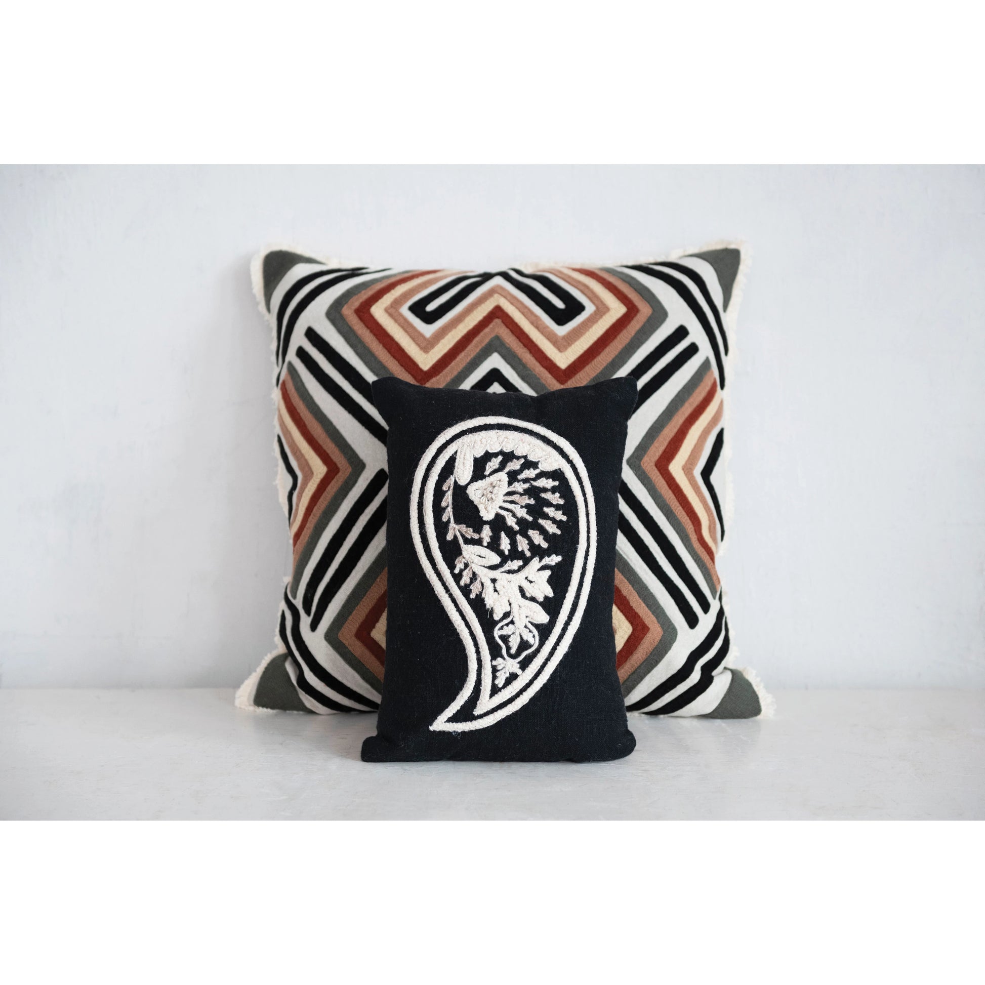 Woven Cotton Slub Lumbar Pillow with Embroidered Paisley